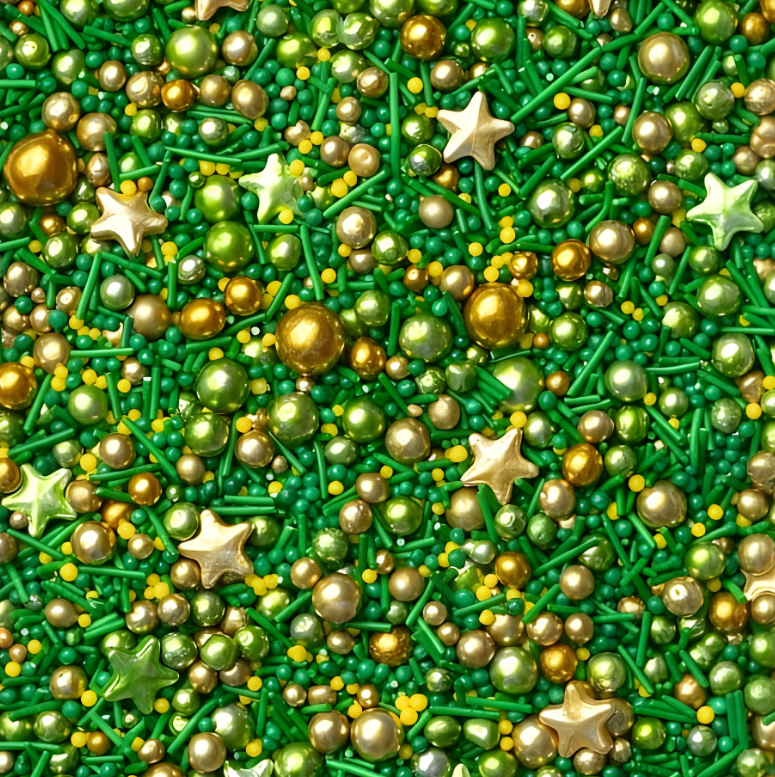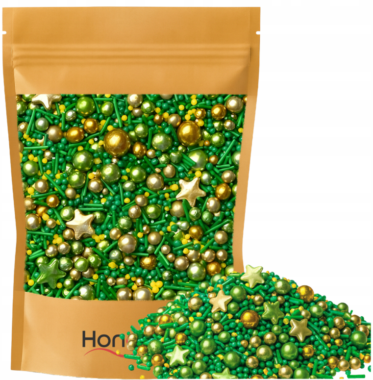 ⭐️Dodaj swoim wypiekom odrobinę luksusu! Ta wyjątkowa mieszanka zielono-złotych posypek sprawi, że każdy deser zyska efekt „wow” już przy pierwszym spojrzeniu. Połączenie połyskujących kulek, gwiazdek i pałeczek tworzy dekorację, która wygląda jak ręcznie komponowana – dzięki czemu Twoje wypieki prezentują się profesjonalnie bez dodatkowego wysiłku.