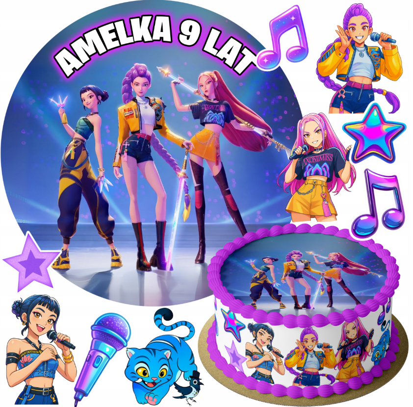 Zestaw Opłatek na tort Huntrix Demon Hunters + 8 postaci + Tekst