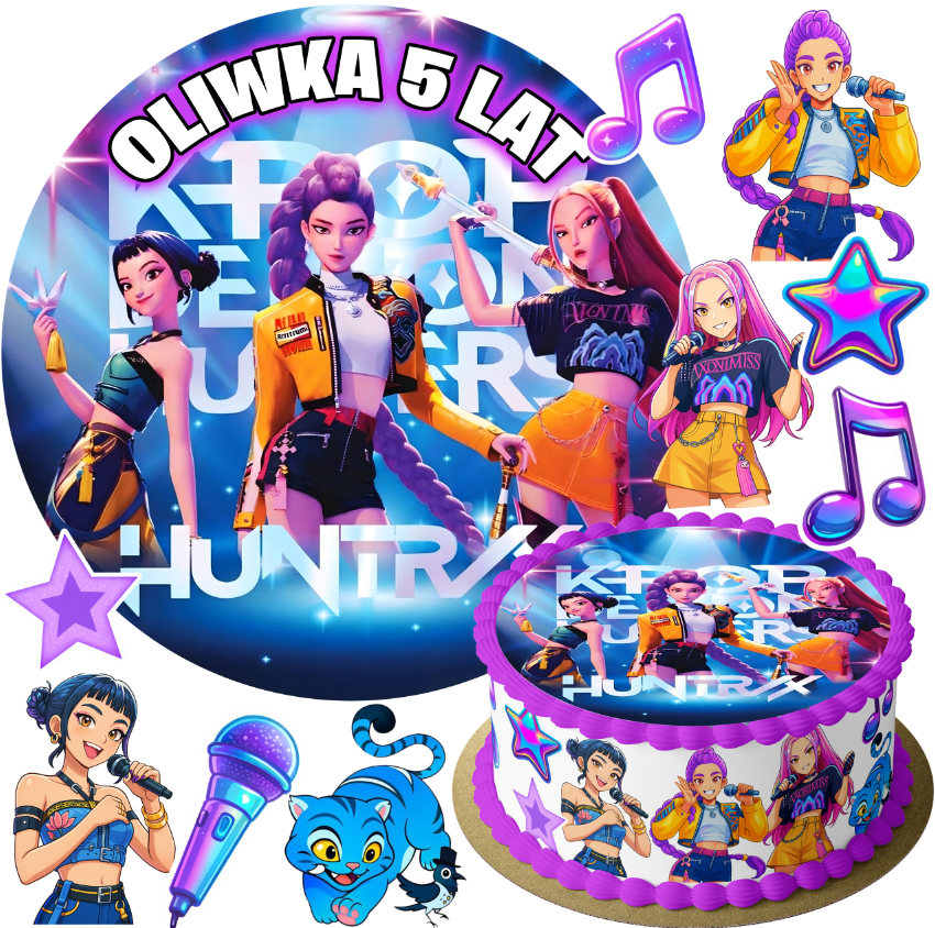 Zestaw Opłatek na tort Huntrix Demon Hunters + 8 postaci + Tekst