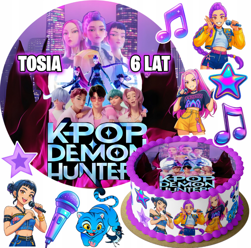 Zestaw Opłatek na tort Huntrix Demon Hunters + 8 postaci + Tekst